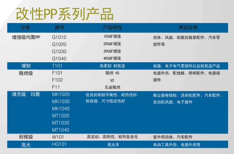 PP具有低密度、抗弯曲疲劳等特点,改性可提高材料机械强度,耐候、高光泽、耐高低温以及阻燃性等,更扩大了使用范围。